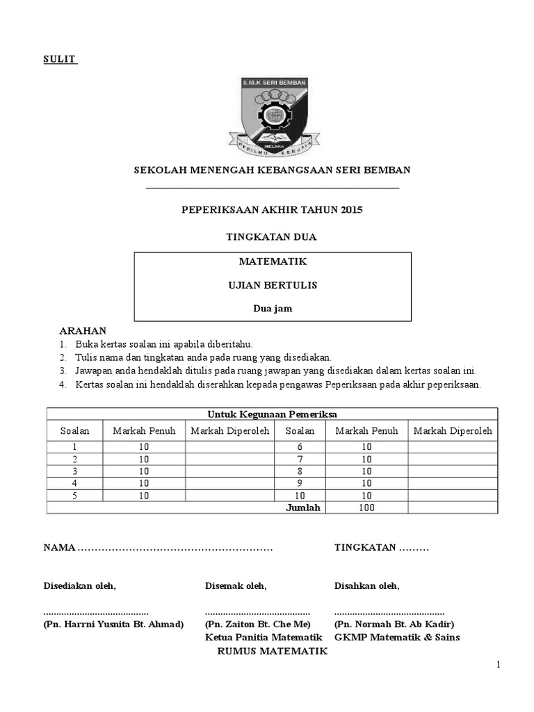 - contoh kertas soalan matematik tingkatan 1 kssm