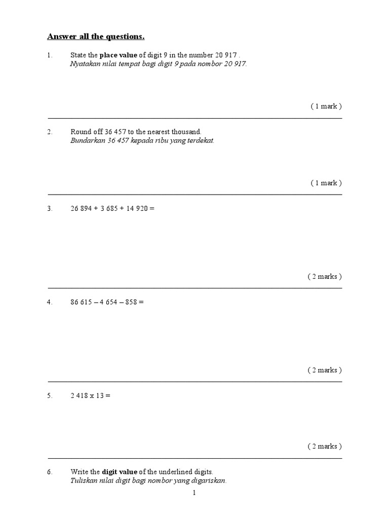 - soalan ujian 1 matematik tahun 5 2020