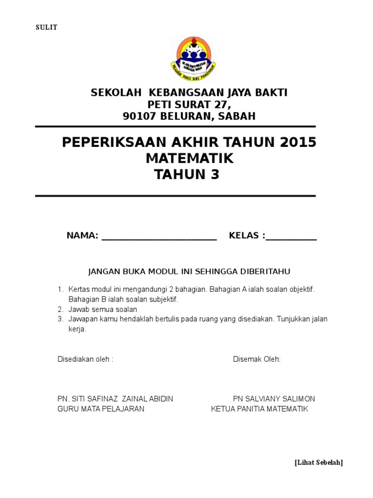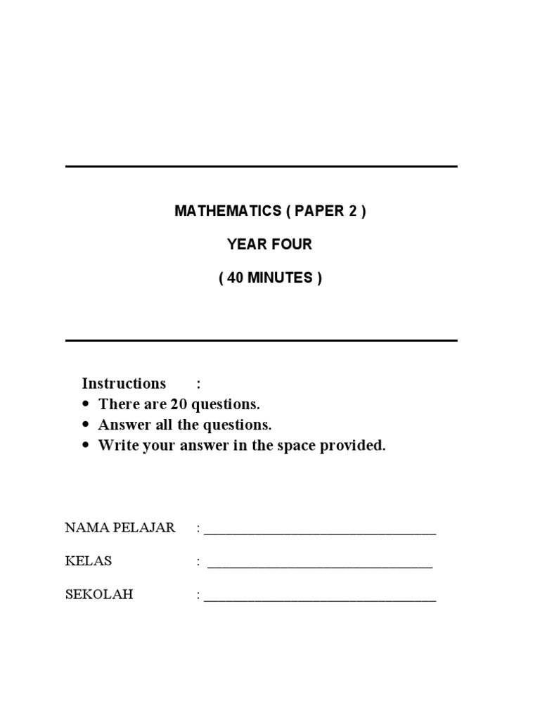 Soalan Matematik Tahun 4 Pdf. Soalan dalam bahasa Inggeris mendahului soalan yang sepadanDocuments. Di sini, kami ingin mengucapkan selamat maju jaya kepada anda semua agar anda semua menempah kejayaan dengan.